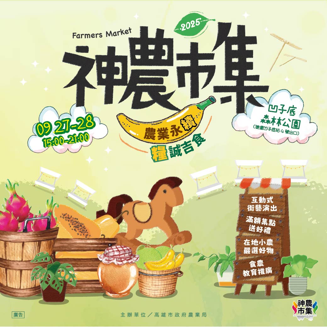 由高雄市政府農業局主辦的「神農市集」,將於9月27日(週六)至28日(週日)在凹子底森林公園盛大登場,本月以「綠植生活+」為主題,本次活動最搶眼就是運用風倒木打造的創意木馬,另也匯集展示50種高雄原生植物、綠植生活講座、植物醫生診所、地景遊戲互動趣味闖關等,除此之外還有百間中南部小農攜手帶來產地直送的優質農產品,市集期間還有輕鬆愉快的音樂演出、親子同樂的魔術秀,以及消費集點換好禮等活動,打造一場結合農業、教育與娛樂的週末綠市集盛會。